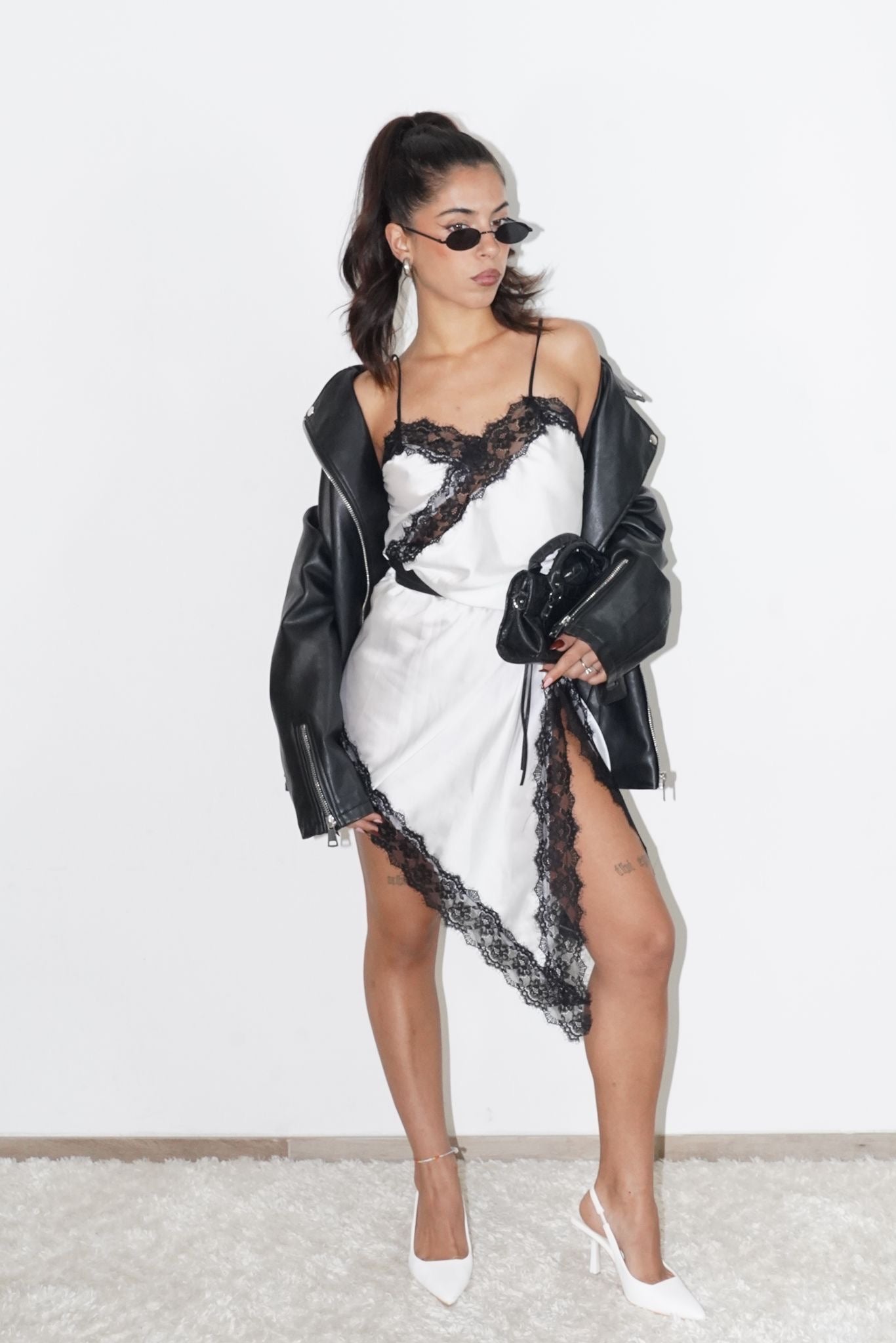Un abito che unisce la delicatezza del Satin alla sensualità del pizzo, per un look sofisticato e irresistibile.
